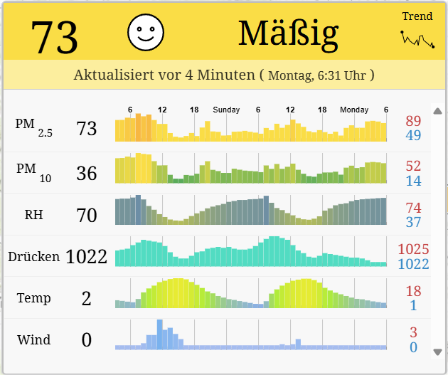 Am Morgen: Teils neblig-trüb mit Sichtweiten unter 500m in den Niederungen. Die Luftfeuchtigkeit ist mit ca. 85-90% sehr hoch. Temperaturen um 2 bis 3 °C.