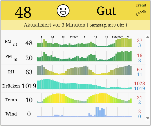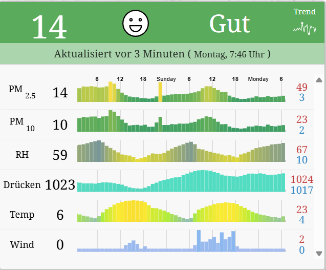 - Vormittag: Ungetrübter Sonnenschein. Die Luftfeuchtigkeit sinkt von anfänglich 85% auf ca. 50%.