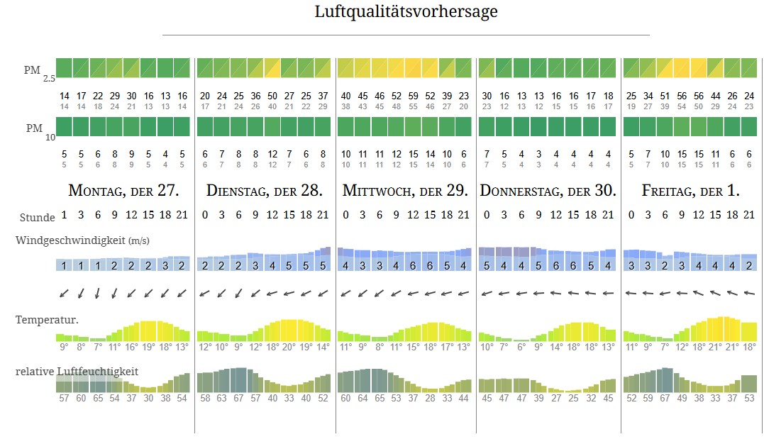 - Abend: Bewölkt, aber trocken. Luftfeuchtigkeit steigt auf 65%.