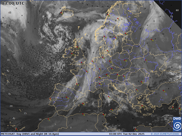 Das Frontensystem eines Tiefs bei den Britischen Inseln liegt über Westdeutschland und kommt kaum ostwärts voran und schwächt sich ab. Dabei gelangt relativ milde und feuchte Luft in die Pfalz.