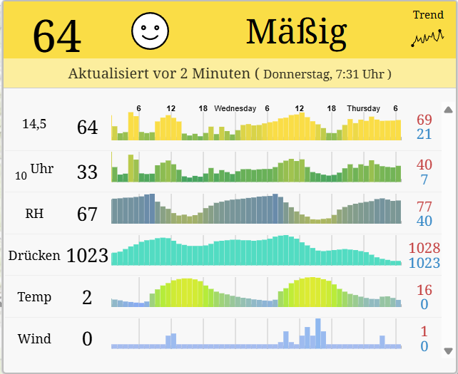Am Morgen: Erneut lokale Nebelfelder, die sich jedoch schneller auflösen als am Vortag. Luftfeuchtigkeit sinkt zum Vormittag deutlich.