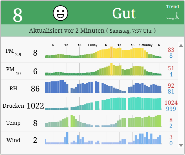 Abend / Nacht: Zunahme der Windböen (bis 45 km/h). Der Luftdruck beginnt leicht zu fallen.
