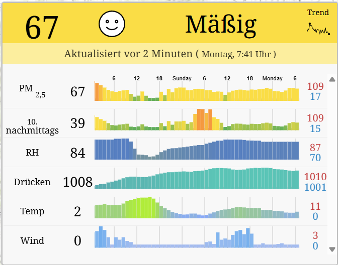 Vormittag (08:00 – 12:00): Zäher Hochnebel oder Bodennebel. Sichtweiten teils unter 200m. Luftfeuchtigkeit bei 94%. Temperatur um 1°C.